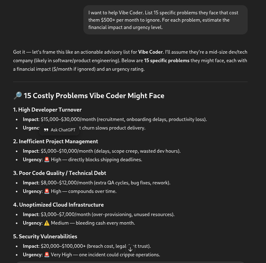 “I want to help [broad market]. List 15 specific problems they face that cost them $500+ per month to ignore. For each problem, estimate the financial impact and urgency level.”
