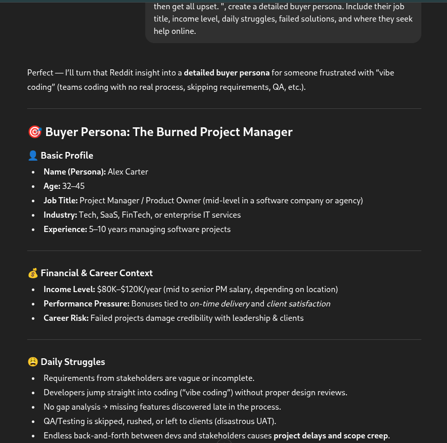 “Based on these Reddit quotes [paste quotes], create a detailed buyer persona. Include their job title, income level, daily struggles, failed solutions, and where they seek help online.”