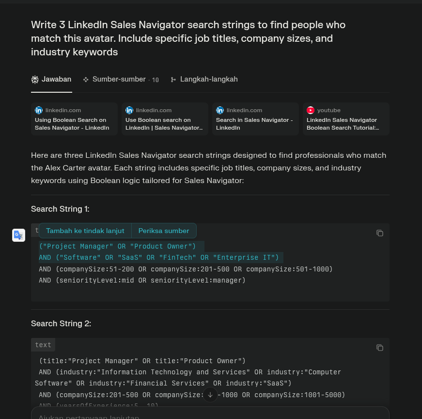 “Write 3 LinkedIn Sales Navigator search strings to find people who match this avatar. Include specific job titles, company sizes, and industry keywords.”